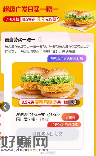 发现精彩app搜索,广发日,找到麦当劳买一送一,一人可以购买2次,需要邀请等