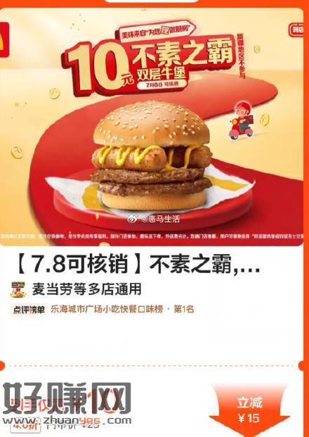 【麦当劳10亓不素之霸双层牛堡】微信打开活动->10亓买不素之霸,仅限7月8日当天可用(没使用会自动退!放心买)