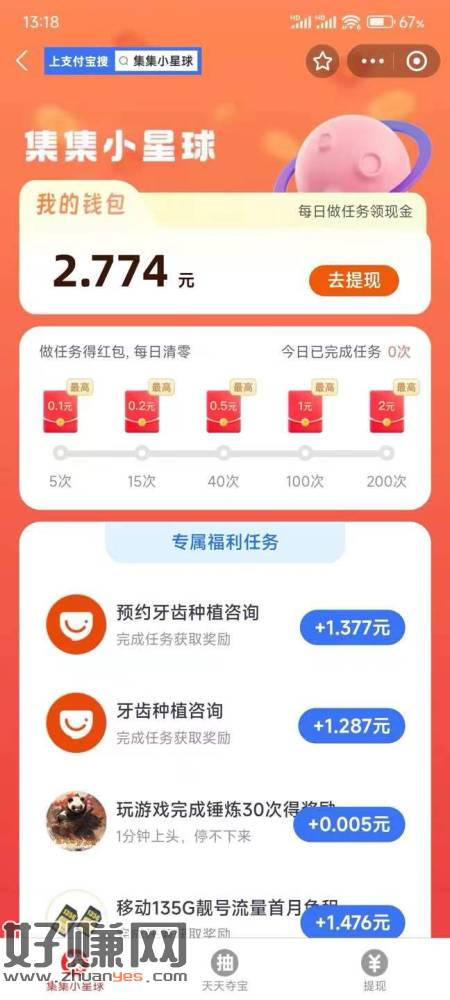 支付宝,搜索-小程序-集集小星球,拉到底,1元左右现金任务奖励,信息随便填,到账直接提现,可以刷新列表,找合适的任务,