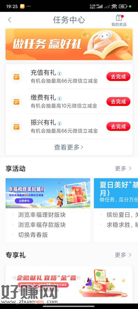 打开工银兴农通,搜索任务中心,点最下面专享礼,企微献礼,一路金喜,一般有抽奖一次,刚中2.88立减金,最高抽38立减金,赶快去抽吧,祝好运!