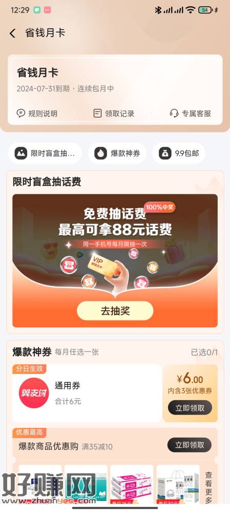 点击底部权益,在【精选权益】里面点击【更多【】进去,然后下拉找到省钱月卡进去,进去显示是五元购买,这个时候直接点击手机返回按钮,然后就会弹窗提示首次。2块9毛9购买,购买完之后可以直接回到页面领到三张两元的券或者一张五元的券,都是满十元使用,第二天才可以使用。可以直接用翼支付扫vx码变现。