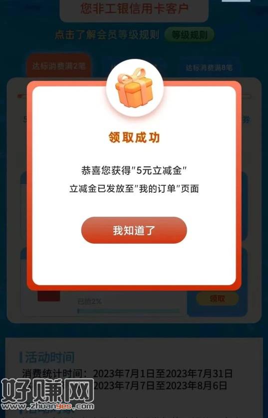 明天工行xyk消费2笔,5元。领取vx、zfb立减金