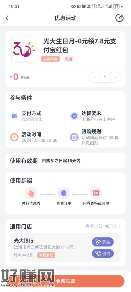 限上海光大信用卡,阳光惠生活app搜索光大生日月,领取7.8