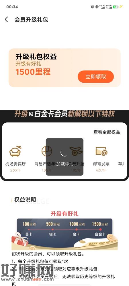 云闪付299积分兑换同程白金卡会员然后去领升级礼 1500里