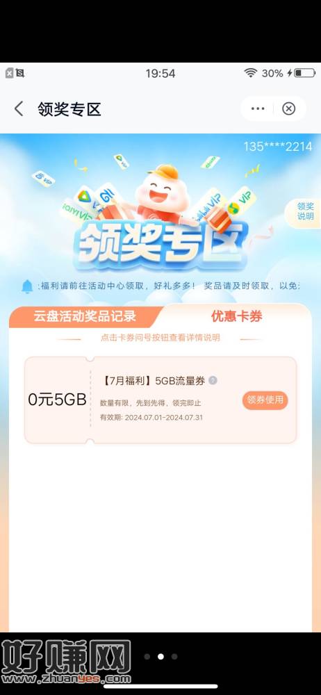 打开中国移动云盘点击我的 领奖中心优惠卡券发送验证码即可领注