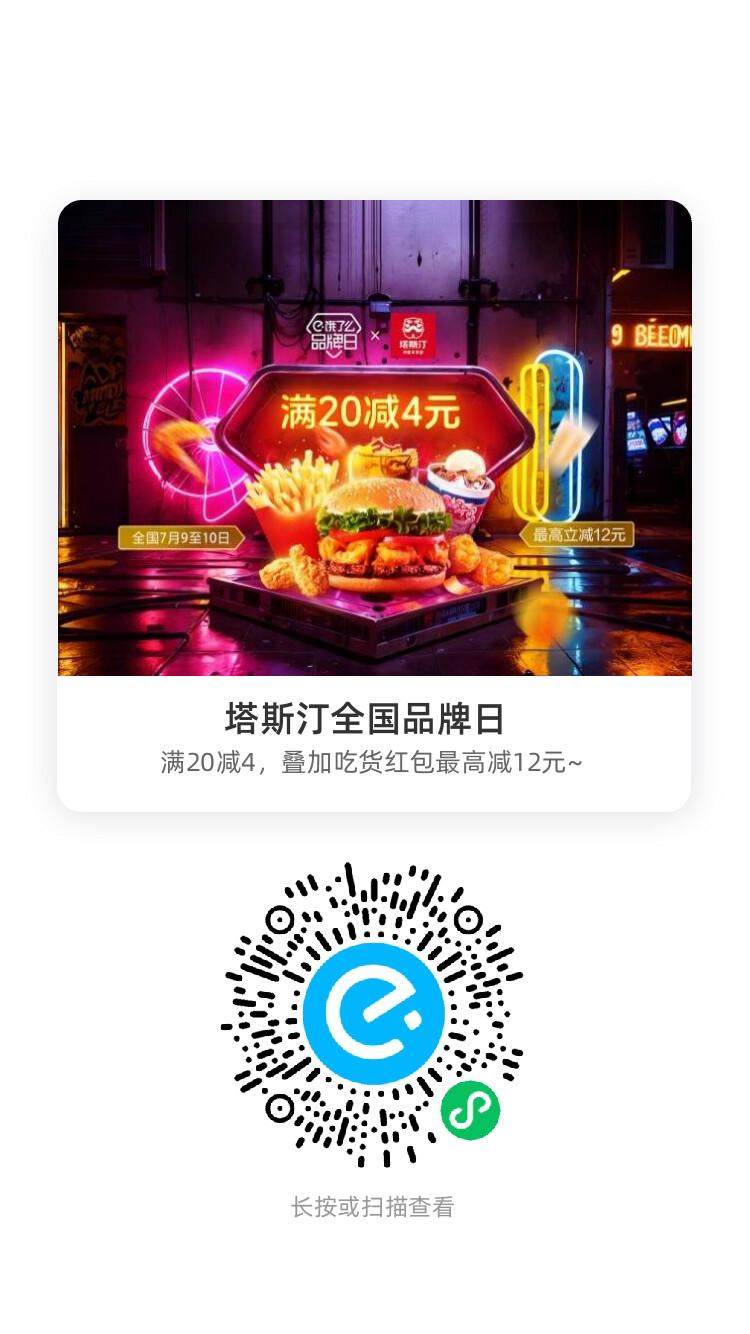 塔斯汀全国品牌日,满20减4,叠加吃货红包最高减12元~