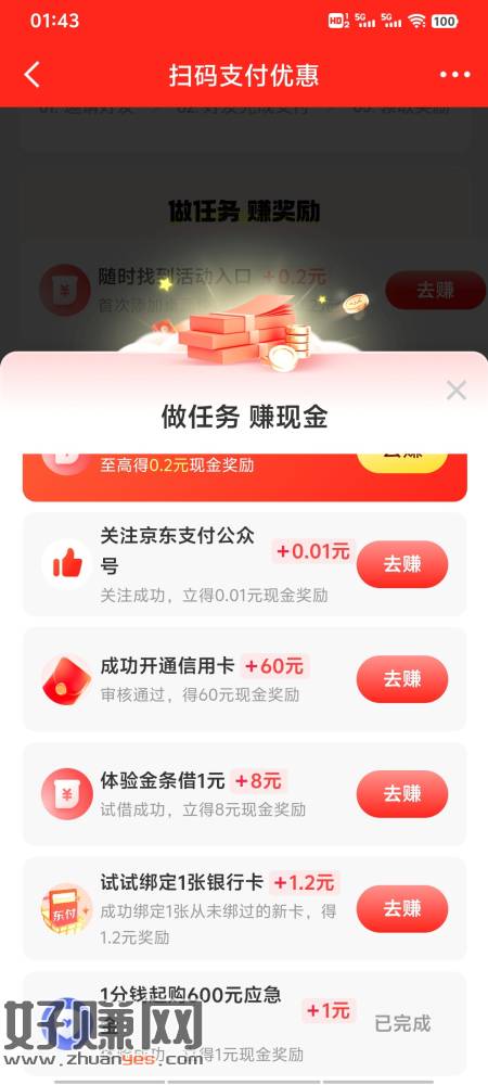 京东金融app-我的-活动集市-扫码支付活动-进入下滑任务 做0.01开保障 开完提现 去退保