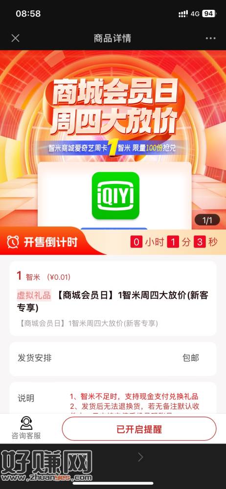 gzh远智教育,个人中心签到领5智米然后点智米商城,每周特惠,1兑换爱奇艺周卡,就100份,手速快点,多号,上次兑换的腾讯次日到账的。
