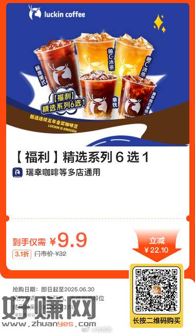 9.9,瑞幸咖啡|【福利】精选系列 6 选 1