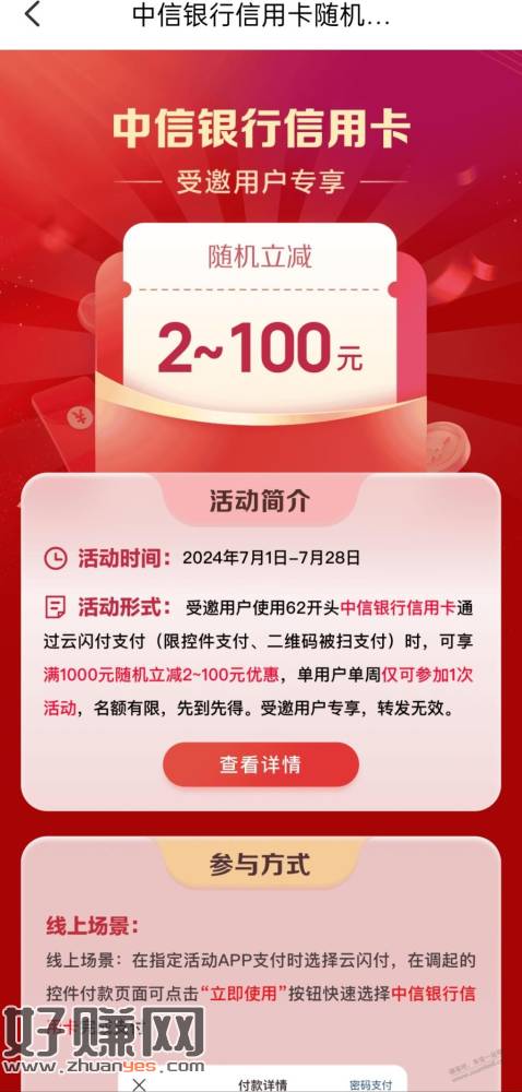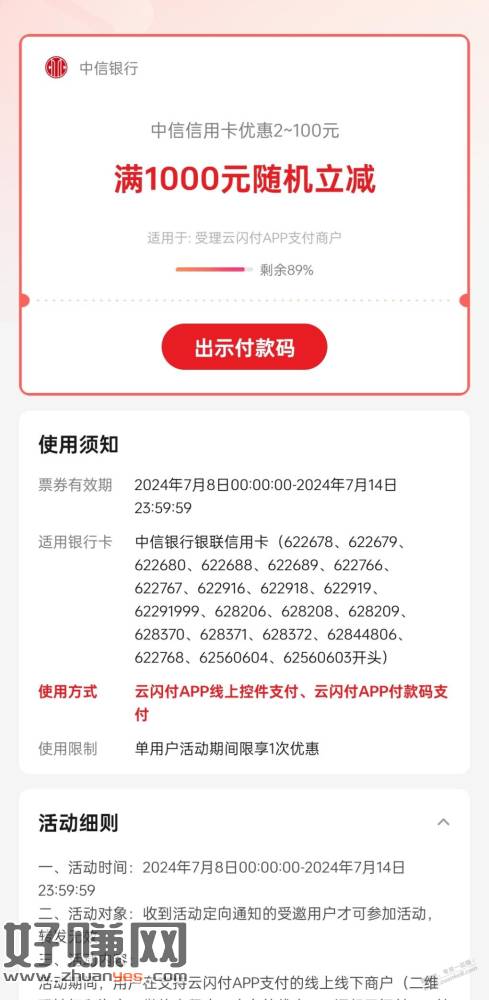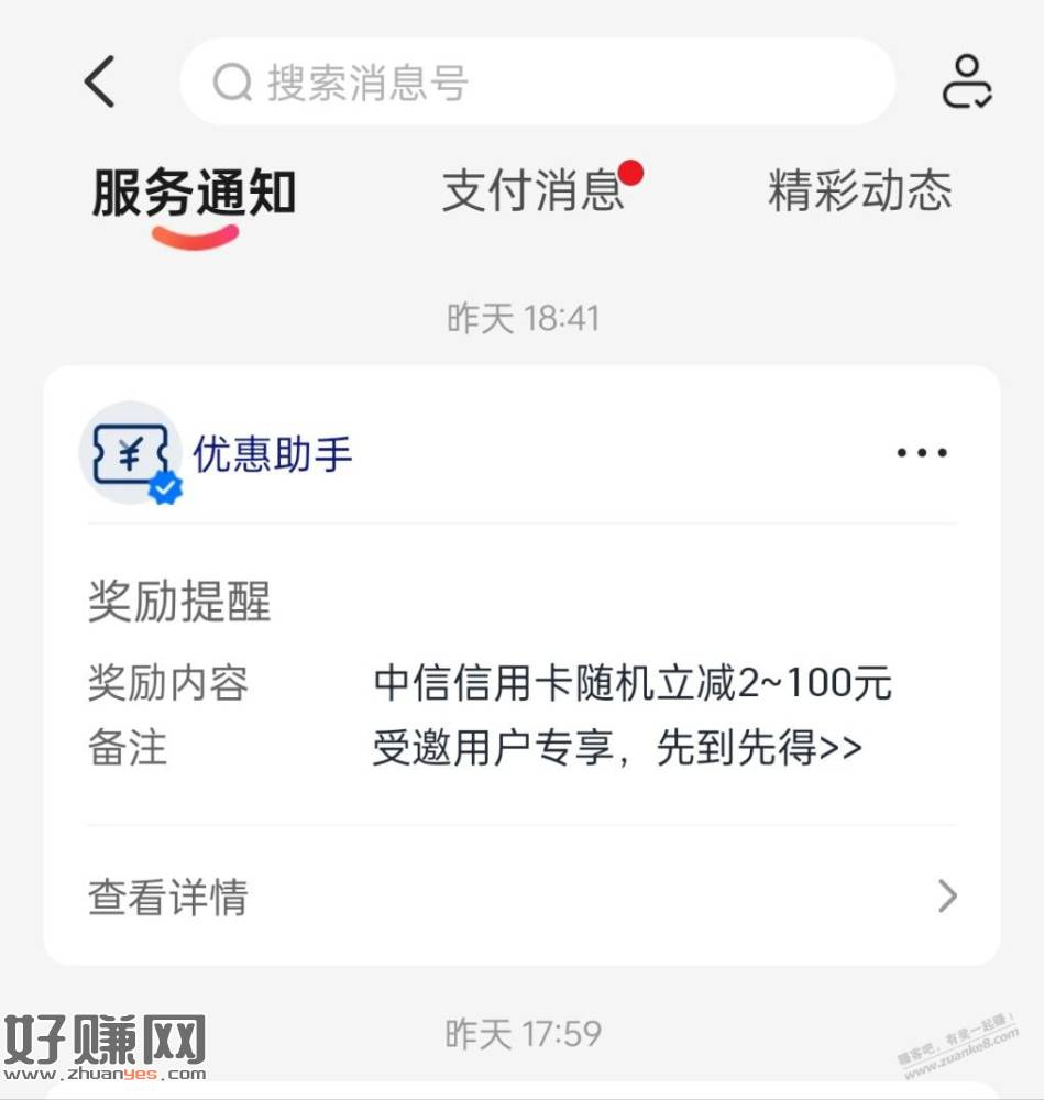 打开云闪付,瘦腰的话,自动会弹出活动页面,没有的话,去消息,服务通知里面看看,中信XYK被扫1000,随机减2-100,我减了五块多,基本亏不了,去试试吧