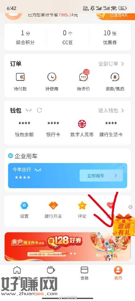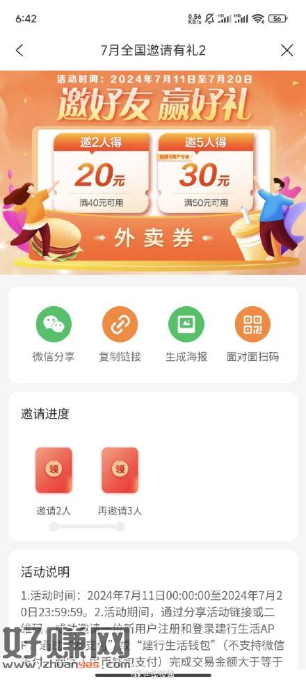 建行生活右下角,邀请有礼,邀请2人得40-20,邀