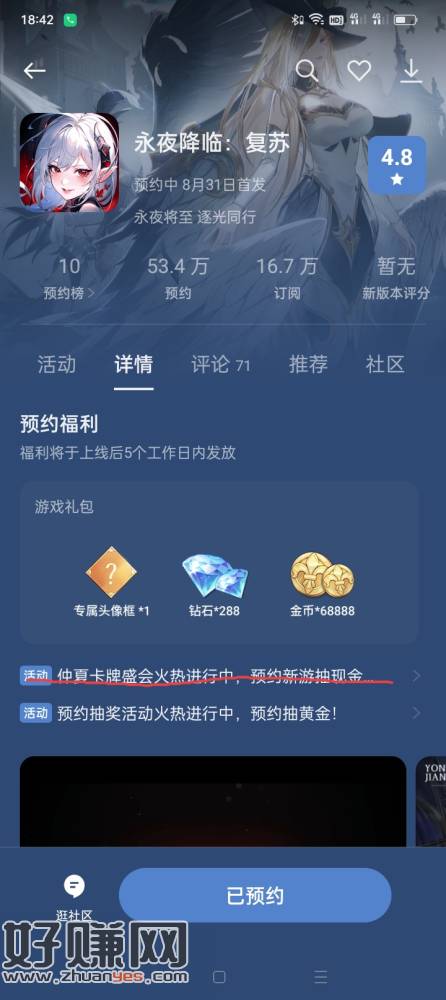 oppo游戏中心搜索永夜降临 点进去第一个预约抽红包 我中1