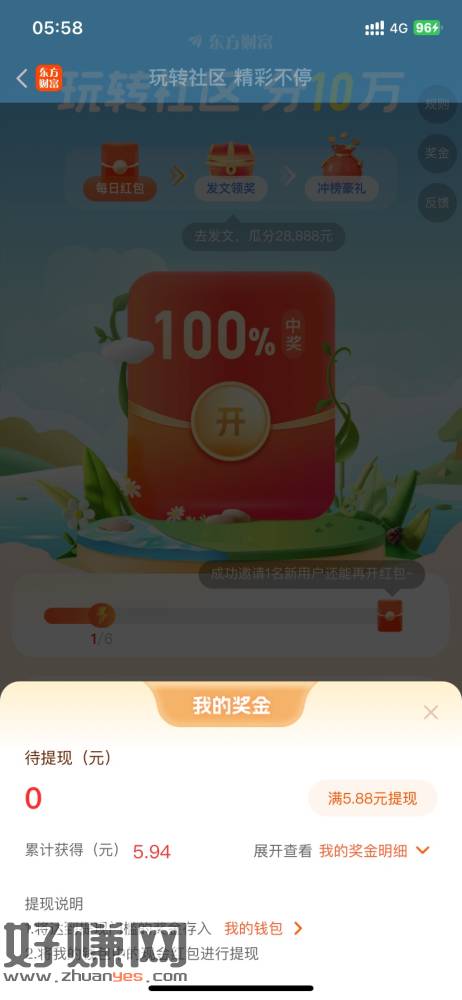 东方财富5毛+,首页玩转社区瓜分红包,天天领红包有3次,发文