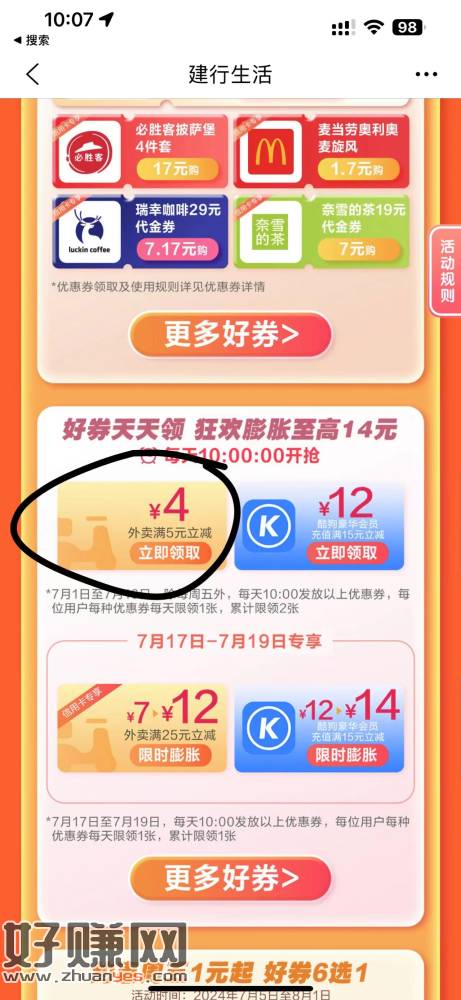 建行生活首页美好生活17进去领5-4外卖 可叠加外卖红包