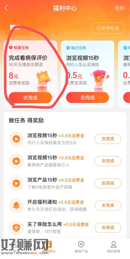 惊喜任务 完成看病宝评价 投保 基础版一个月 5.88 投完八块钱话费卷