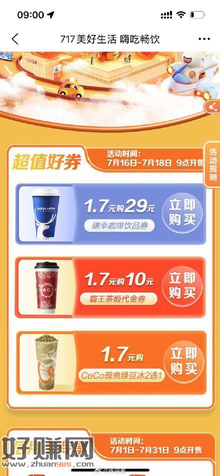 建行生活首页1.7元起购,每天9点有1.7买瑞幸霸王等