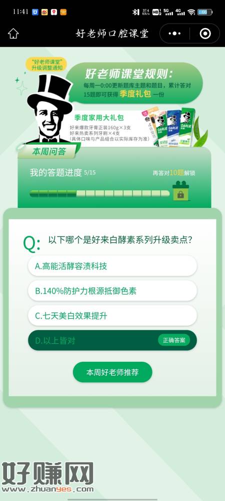 微信打开地址->每周1一道题目,连续答对15周领黑人牙膏礼包