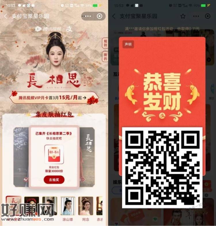 打开支付宝APP扫描截图上二维码或者搜索“聚星乐园”进去点长相思第二季进去,下拉页面完成所有浏览任务可以抽奖1次,金额随机,中到的现金红包秒到支付宝余额里,限量3万份