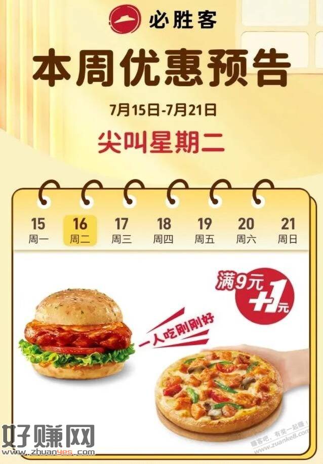必胜客 周二 需满9 可随1亓汉堡/披萨