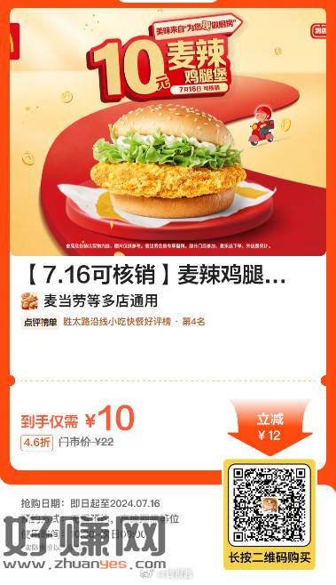 麦当劳今天是麦辣鸡腿堡,可搭配雪碧
