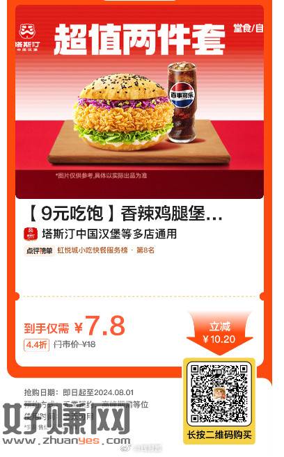 7.8,塔斯汀中国汉堡|【9元吃饱】香辣鸡腿堡+可乐