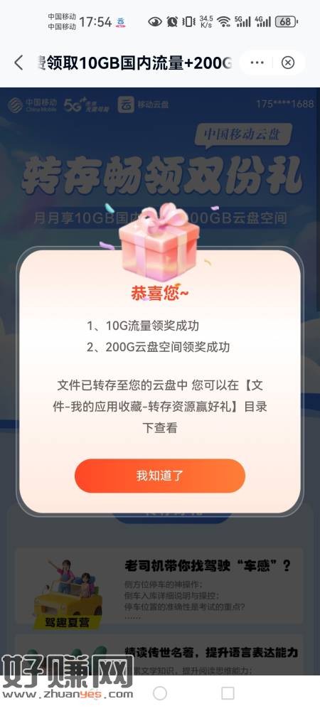 [ 中国移动 ]来移动云盘APP,转存资源领取7天10GB国内流