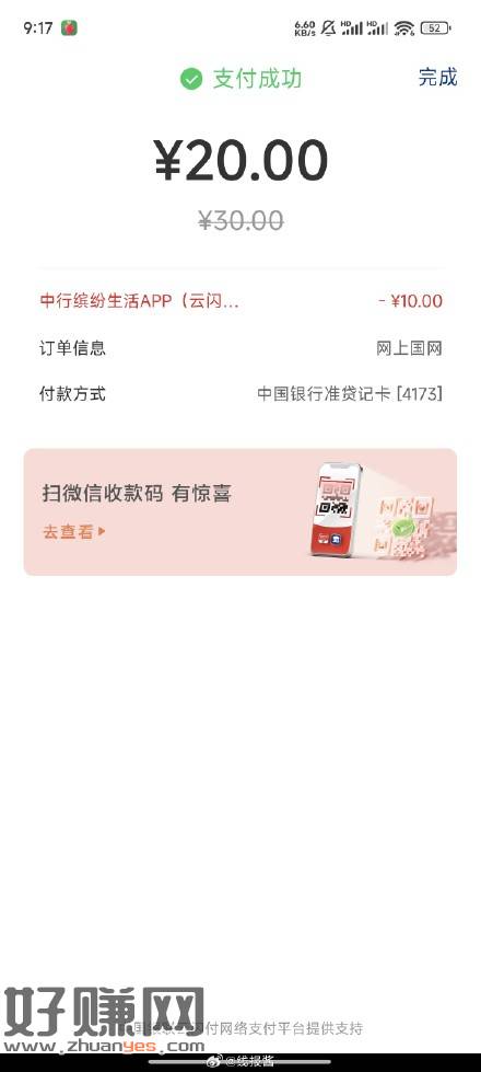 网上国网App交30话费用中行信用卡缤纷生活App付有30-10,每日名额有限,付款前可以看到