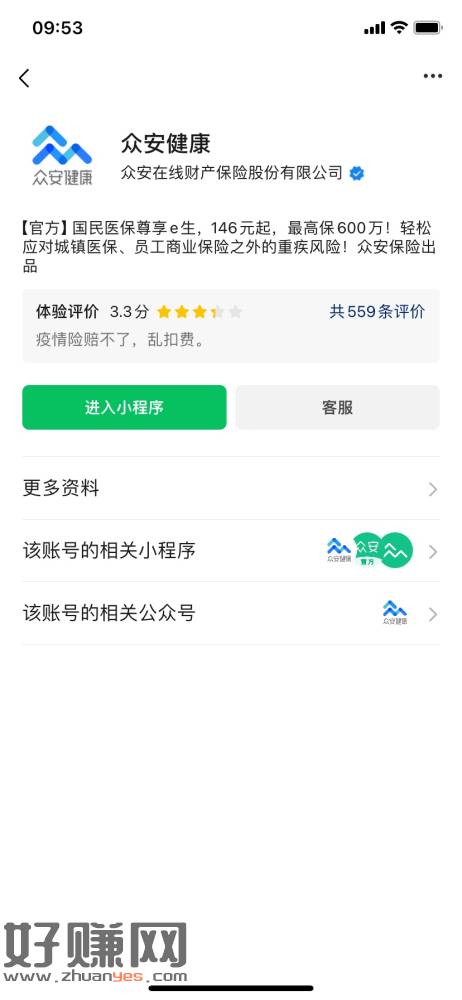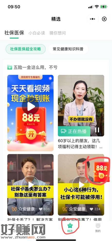 小程序 众安健康 点击 精选 下角有个红包 点看视频 大小号互提0.4 。