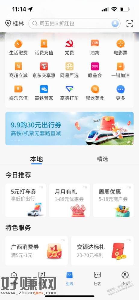 交行App,生活,选桂林,特色服务交银达标礼,我的是2类卡,属于桂林分行,这个应该是广西都可以参加,是不是特邀自测.交行资产活动都是随便哪张卡达标都算,所以我是转到其他1类卡就达标,码字不易,领到的给个果果,谢谢