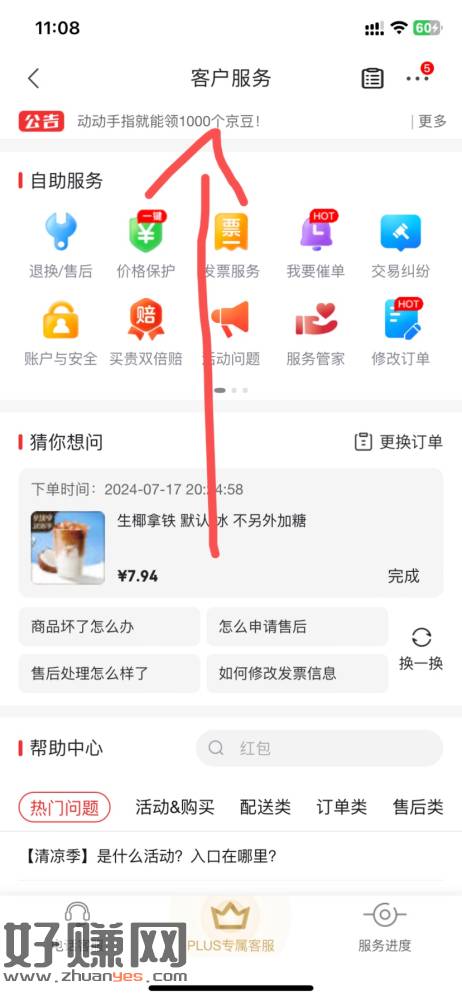 京东-客户服务-上面公告,领4000京豆/月,一周1000豆,发红书,阅读没要求