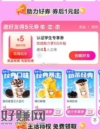 【京东学生邀1人助力1元撸实物】新一期!打开地址跳转到京东APP->邀请1人助力领5元券(可1块钱喝蜜雪冰城