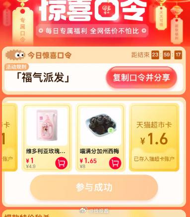 猫超右下角惊喜口令输入【福气派发】,可翻猫卡有1.6