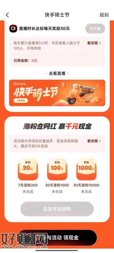 快手搜索快手骑士杰,最下面参与活动,涨粉奖励钱