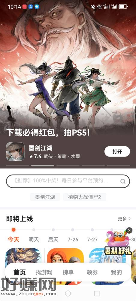 下个九游,然后首页横幅第二个墨剑江湖,只下载游戏就500M,
