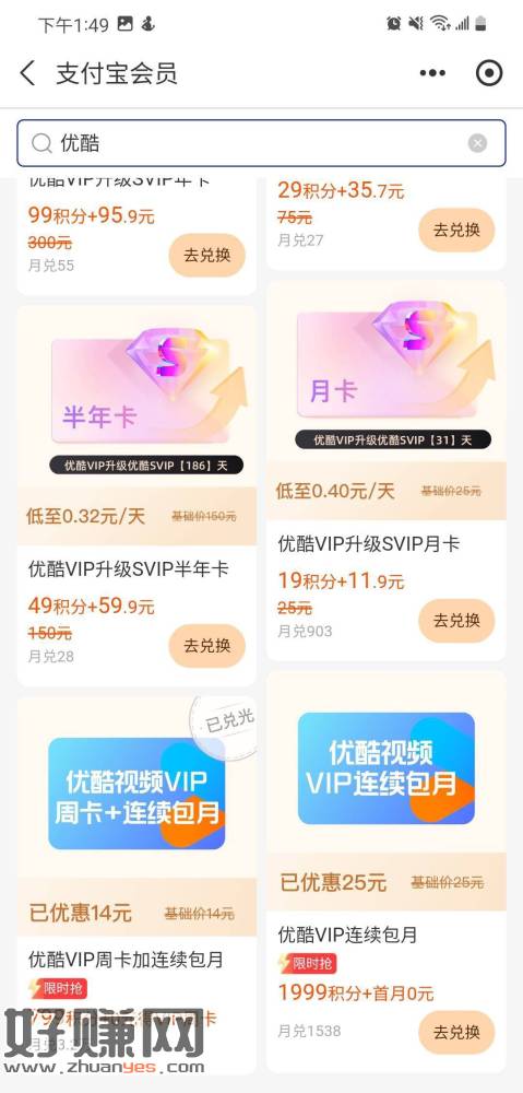 全球首发 支付宝1999积分兑换优酷月卡会员 换了之后取消