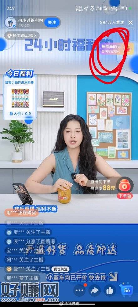 支付宝扫,直播间右上角抽完,直播间有款水提交1.5