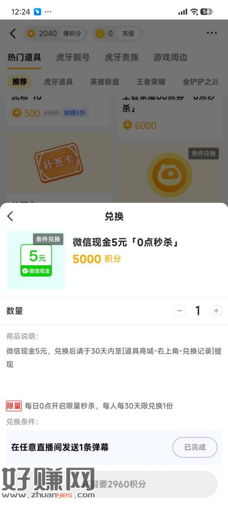 虎牙有积分的5000换5元微信秒到账,今天没了就明天去,卡在