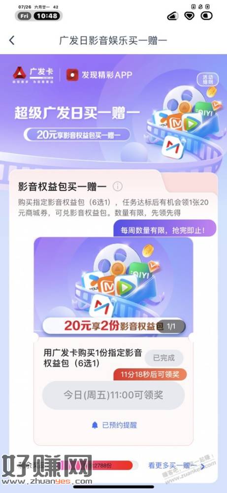 app点击中间超级广发日买一赠一,最下面影音娱乐,20买腾讯,11点再领一次,润10左右