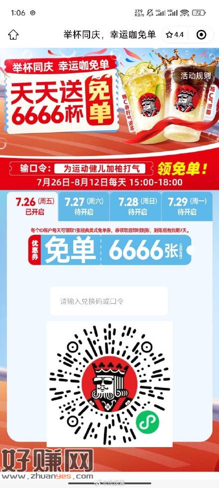 7.26-8.12,每日15点,幸运咖免单,口令: