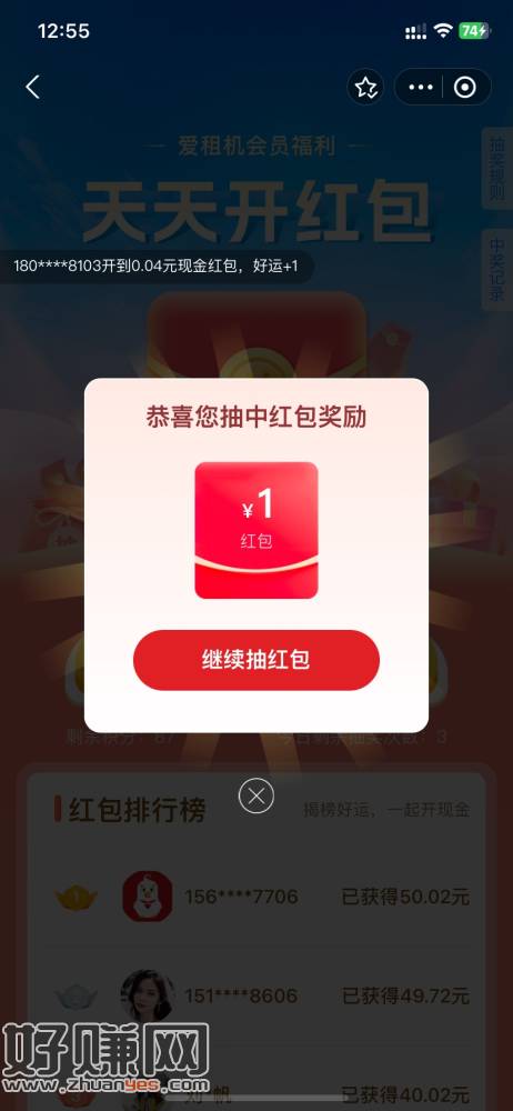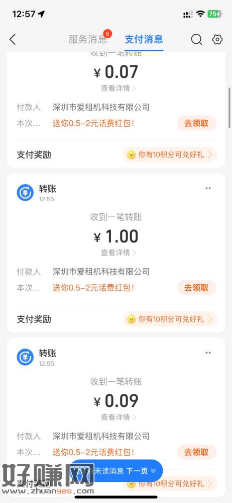 zfb搜爱租机~我的~签到有礼~下面任务做50积分~天天开现金,抽5次,多号