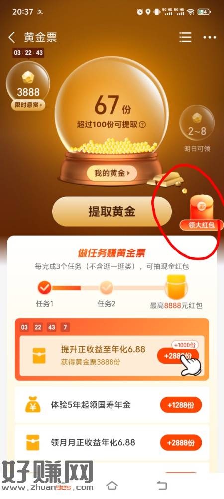 支付宝黄金票右侧领大红包,有3个消费红包可以领,共5.64,