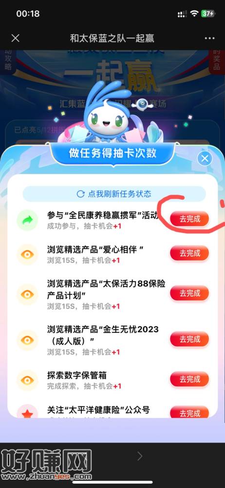 gzh太平洋寿险,云上运动会左上抽奖所有号过一遍每个号必中一次全领一个支付宝里,下面太保蓝活动进去点任务跳转掼军活动,技能答题3次然后点休闲登陆返回3次一共6次抽完