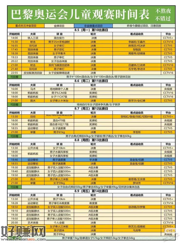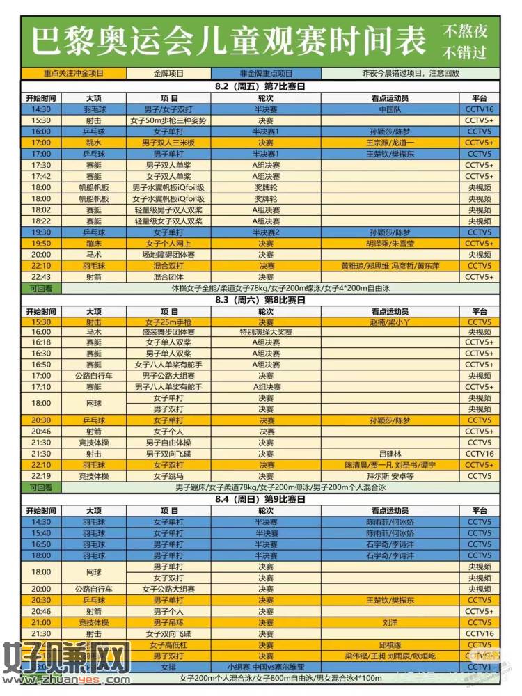 巴黎奥运会儿童观赛时间表,不熬夜,不错过