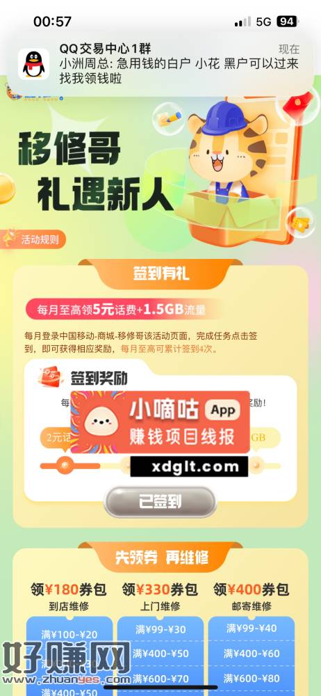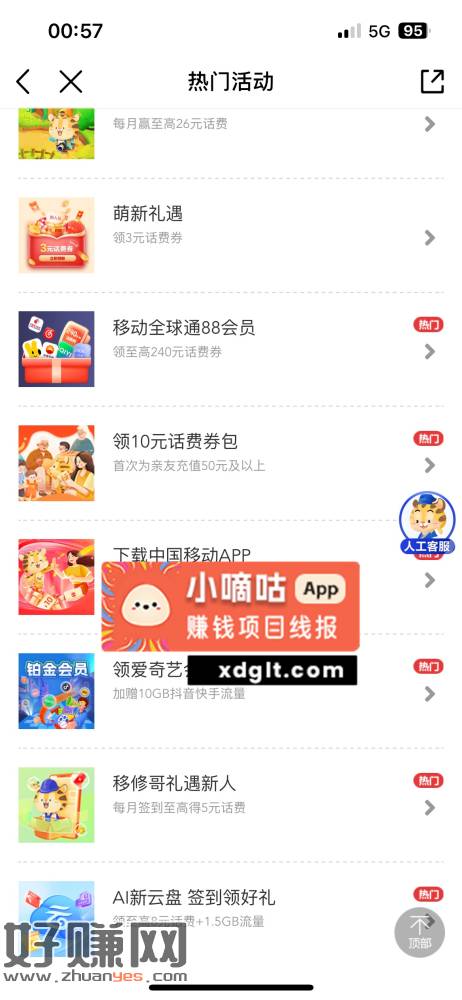 移动app 最下面2个活动,签到送5➕8话费还有流量,新一