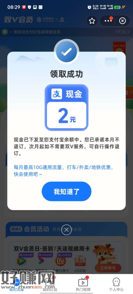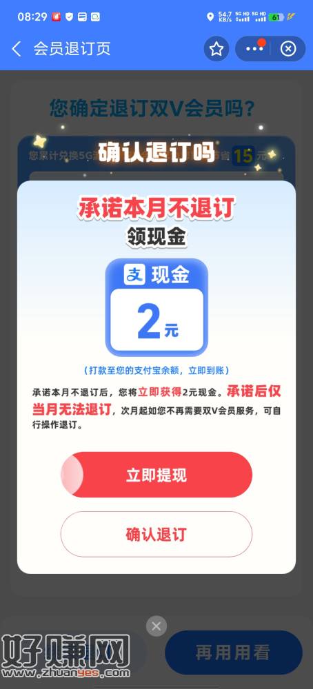 zfb双v会员退订返2红包 有的人没有,都去看看,已经订过的提示不给直接退订,然后看下有没有首月0元的 再点退订就返2