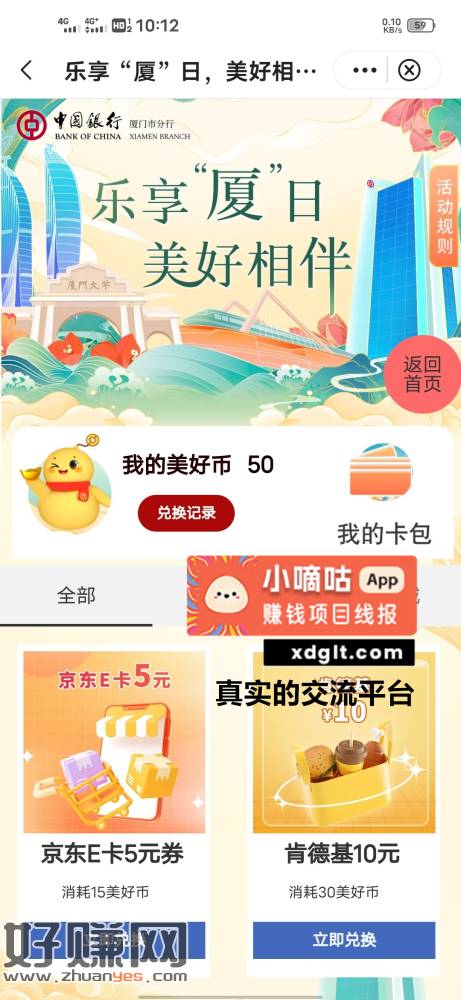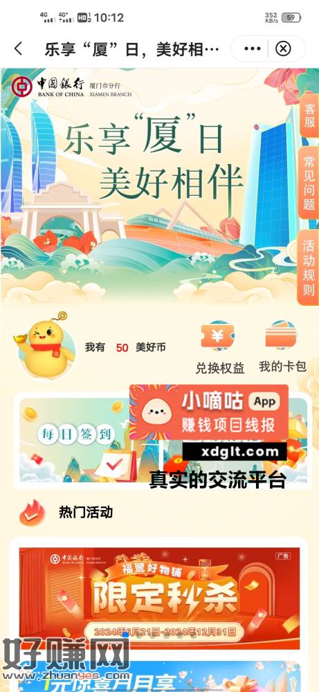 中行飞厦门,乐享夏日,做浏览任务50币可以兑换3张5E卡,还