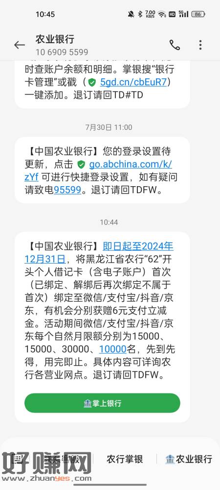 【中国农业银行】即日起至2024年12月31日,将黑龙江省农行“62”开头个人借记卡(含电子账户)首次(已绑定、解绑后再次绑定不属于首次)绑定至微信/支付宝/抖音/京东,有机会分别获赠6元支付立减金。活动期间微信/支付宝/抖音/京东每个自然月限额分别为15000、15000、30000、10000名,先到先得,用完即止。具体内容可详询农行各营业网点。 这个大家也可以试试 我是暂时弄不了
