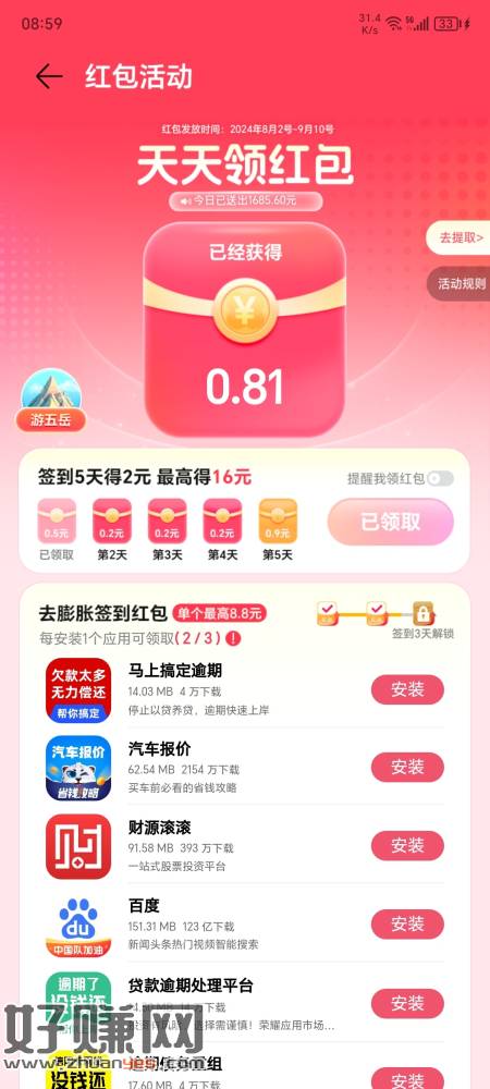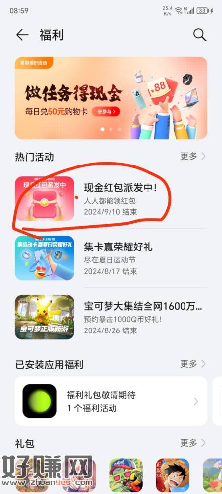 荣耀手机——应用市场——福利——现金红包派发中 每天拉满