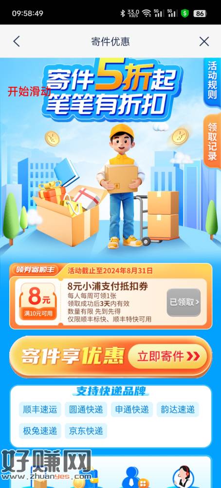 浦发APP-生活-全部-惠寄件 领10-8 顺丰券