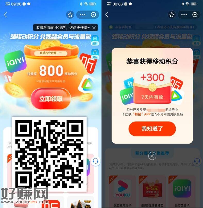 中国移动领300-800个和包积分】新一期,打开支付宝APP扫码进去,中国移动号码可以领到300-800个和包积分,刚领300个积分(价值3元左右),可以累积在和包APP里兑换云闪付红包、或者支付宝红包